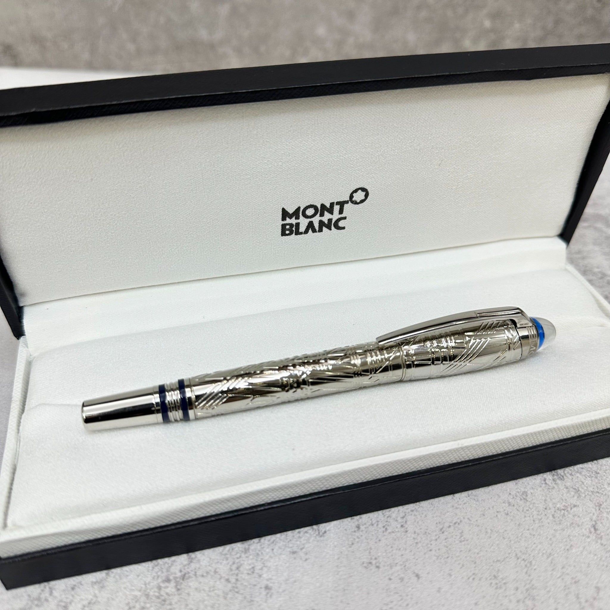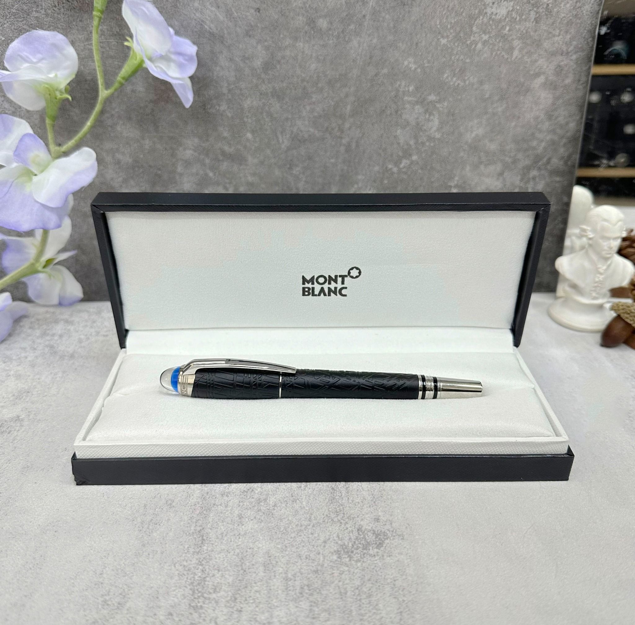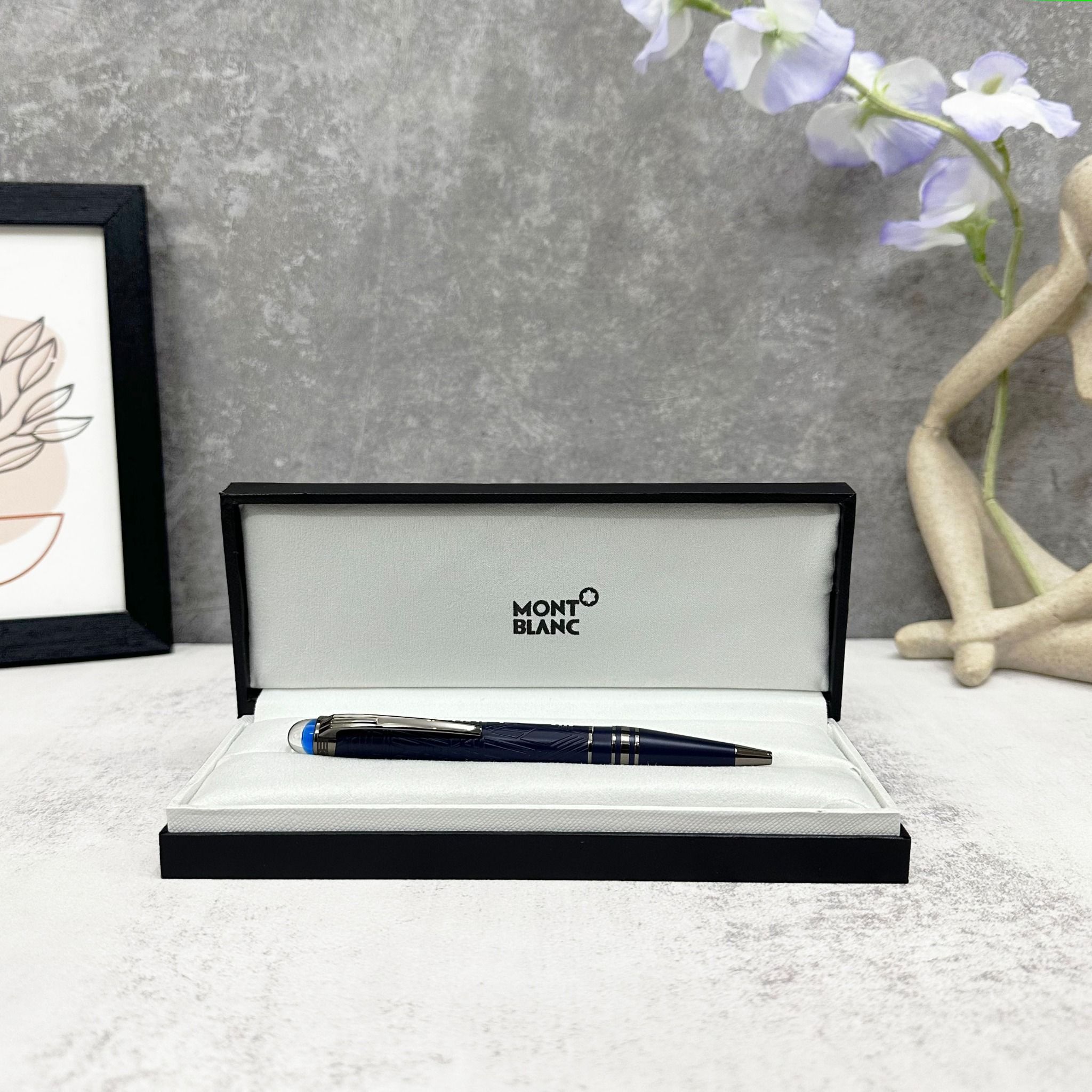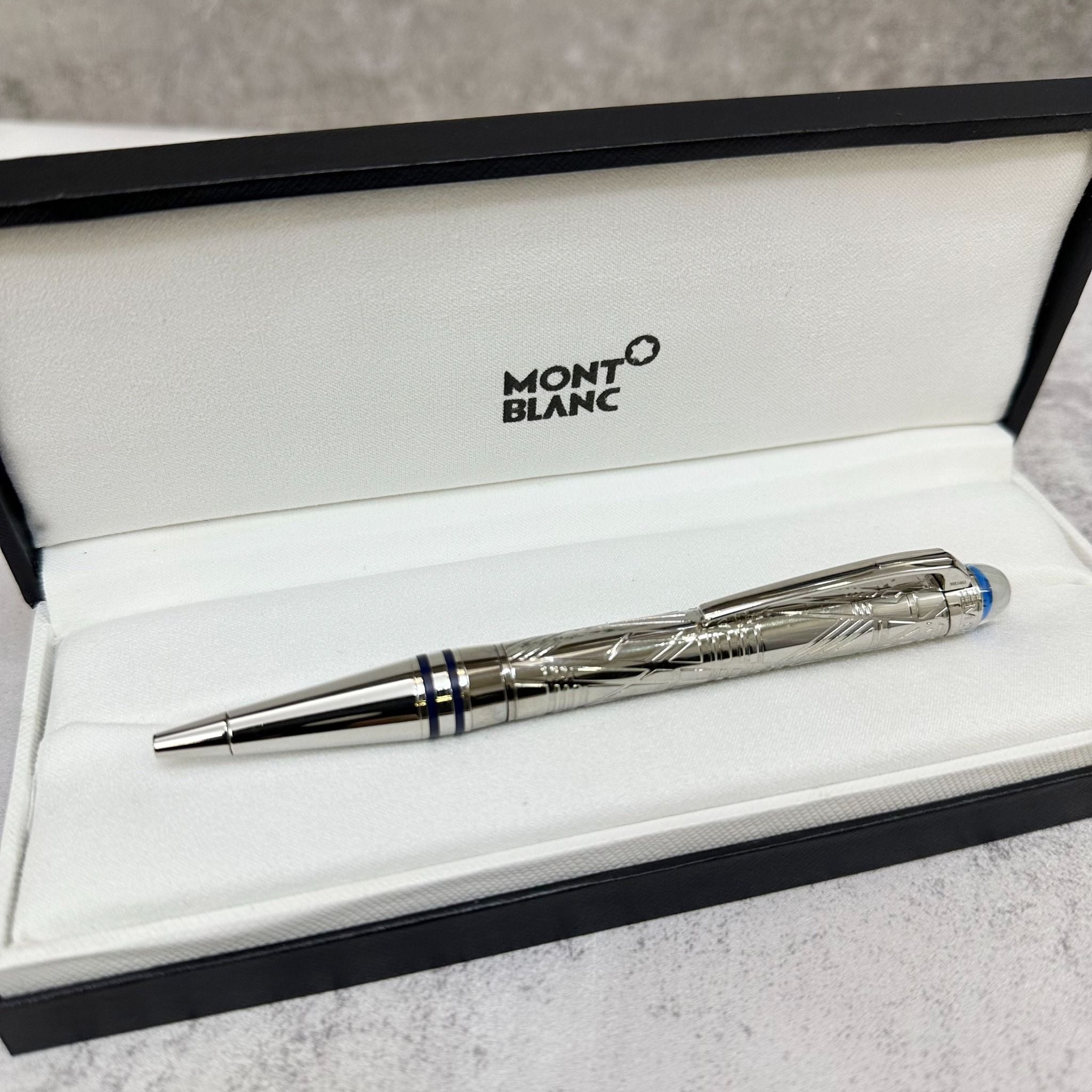 Với thân bút được làm từ nhựa Resin quý, thiết kế điểm nhấn bằng họa tiết Widmanstätten Pattern. Biểu tượng MontBlanc nổi trên nền xanh ở phần mũi trong suốt.