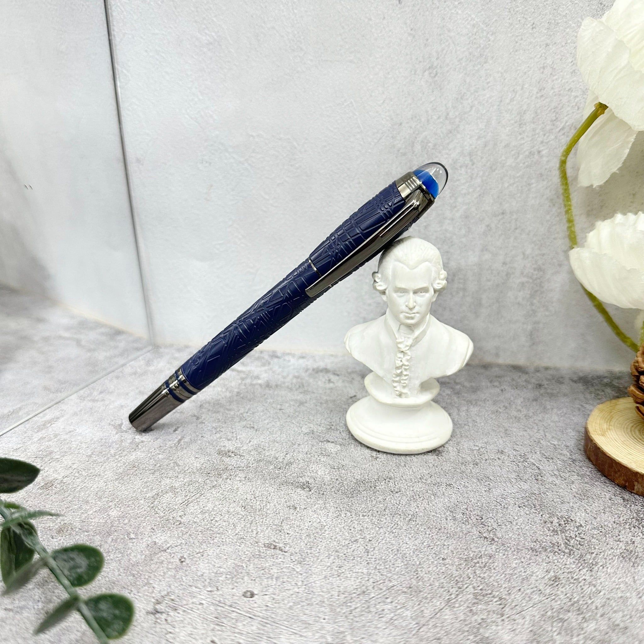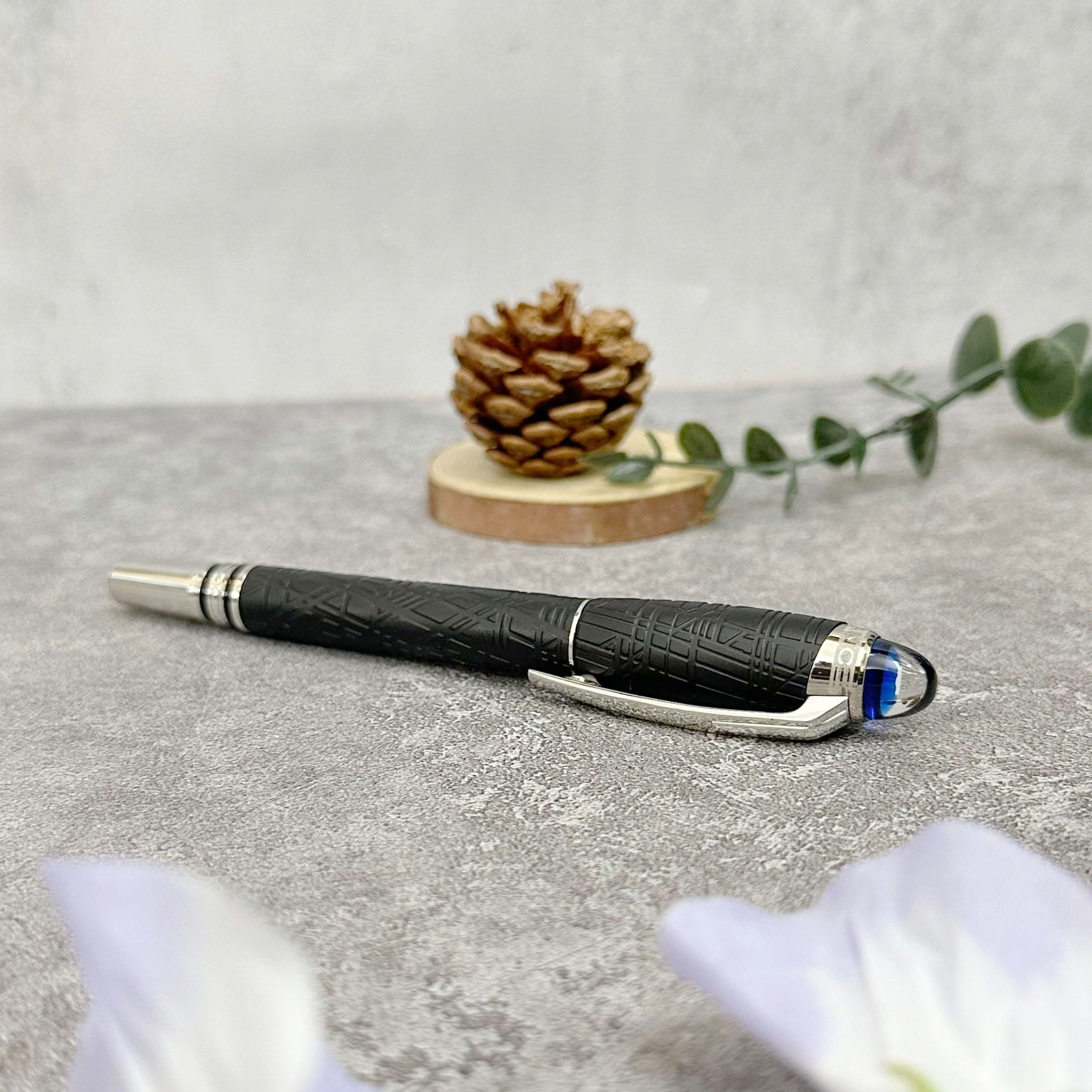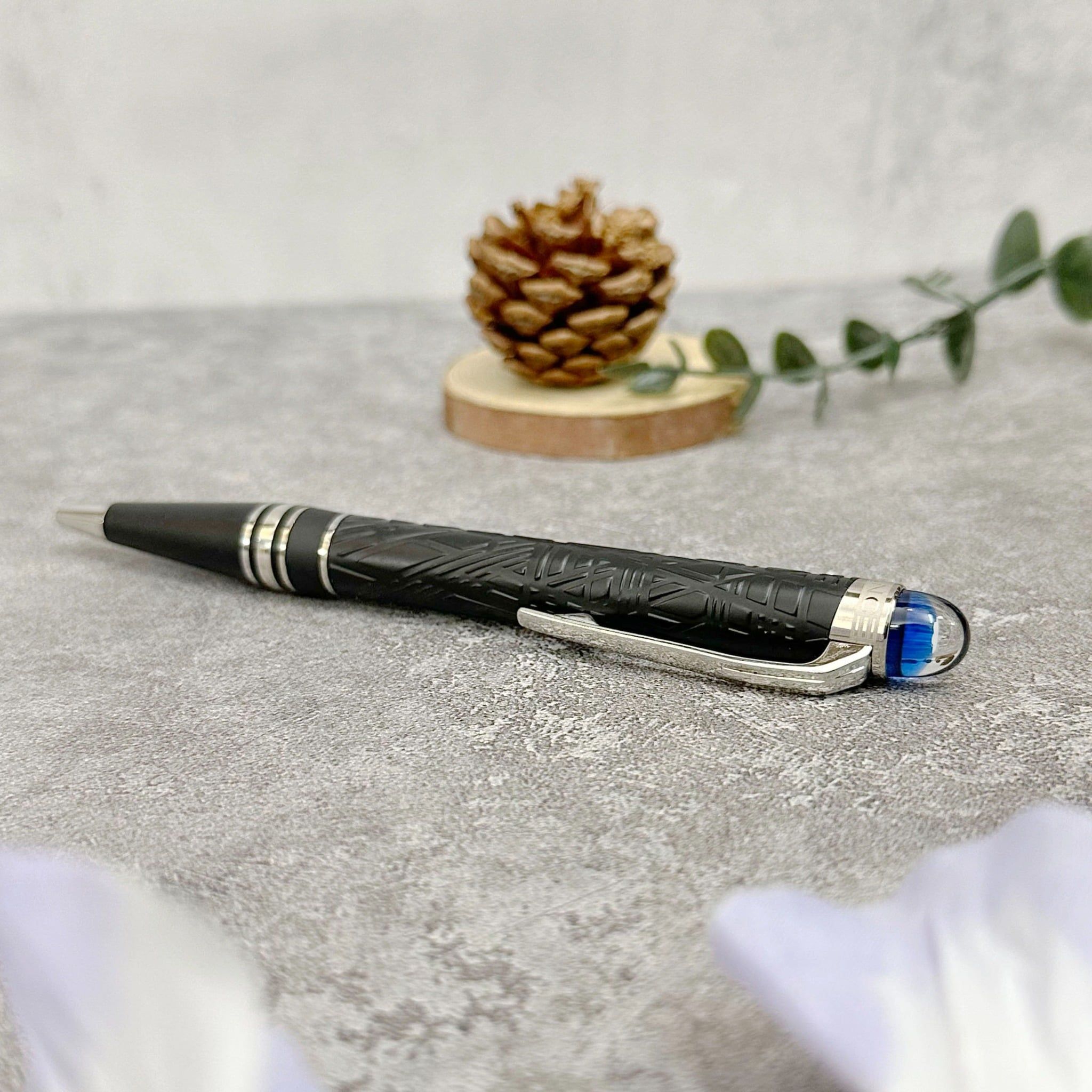 Với thân bút được làm từ nhựa Resin quý, thiết kế điểm nhấn bằng họa tiết Widmanstätten Pattern. Biểu tượng MontBlanc nổi trên nền xanh ở phần mũi trong suốt.