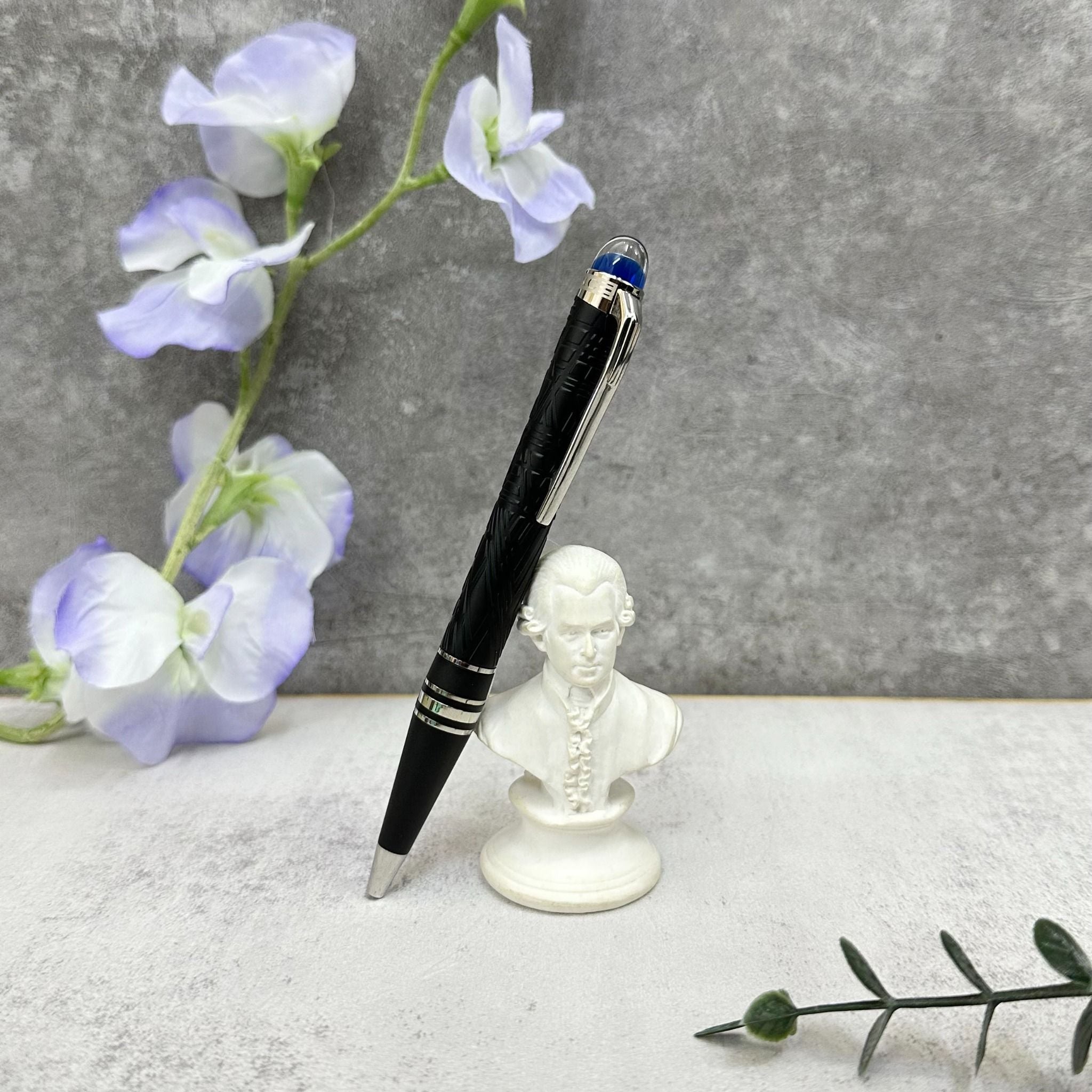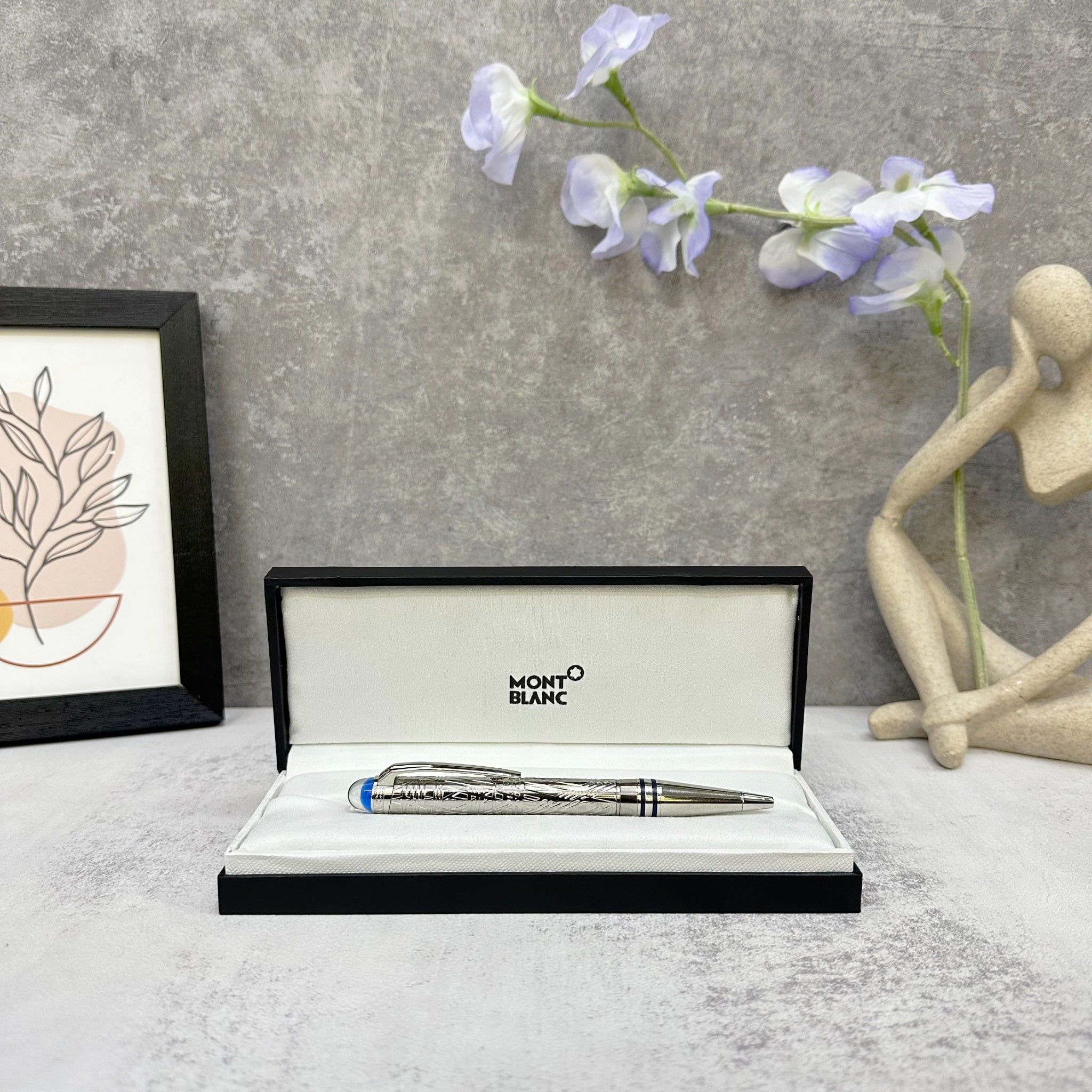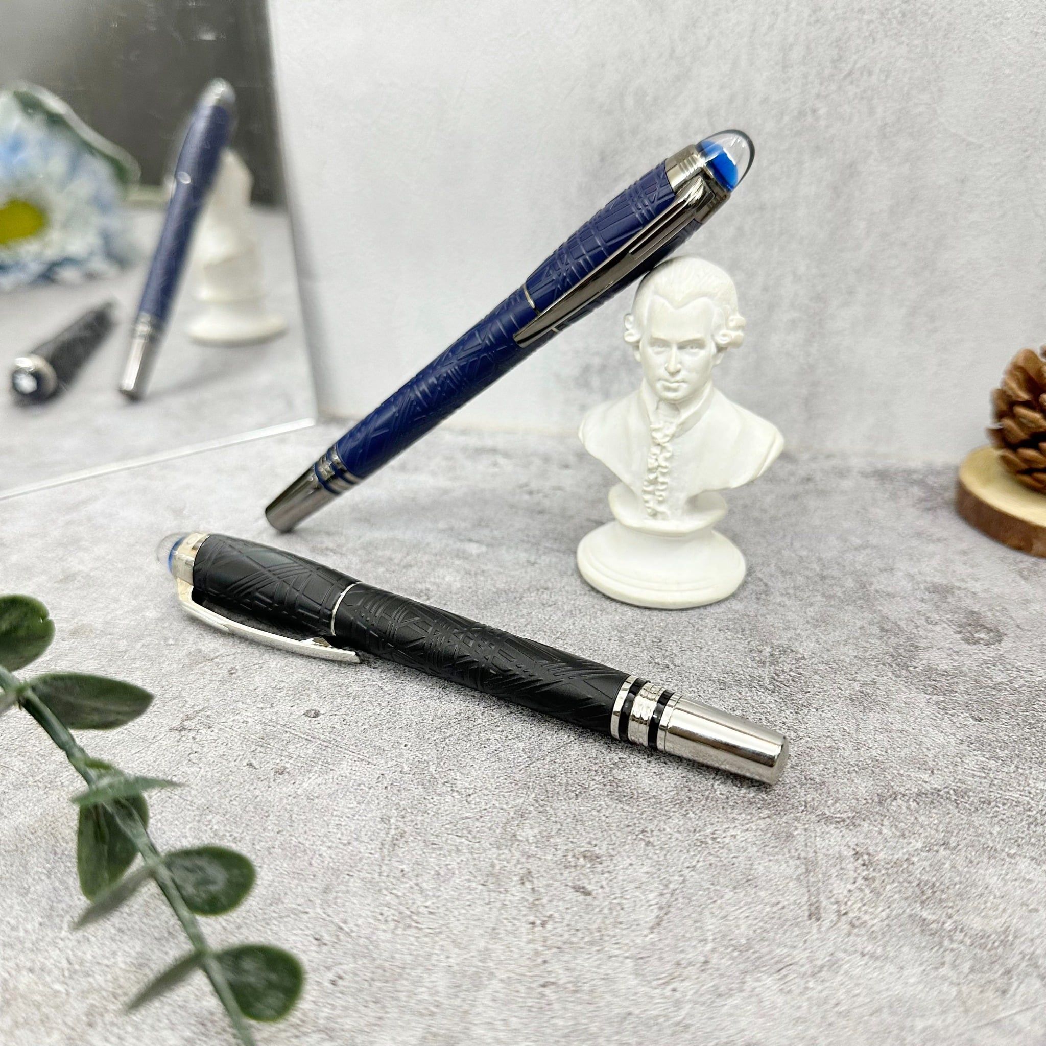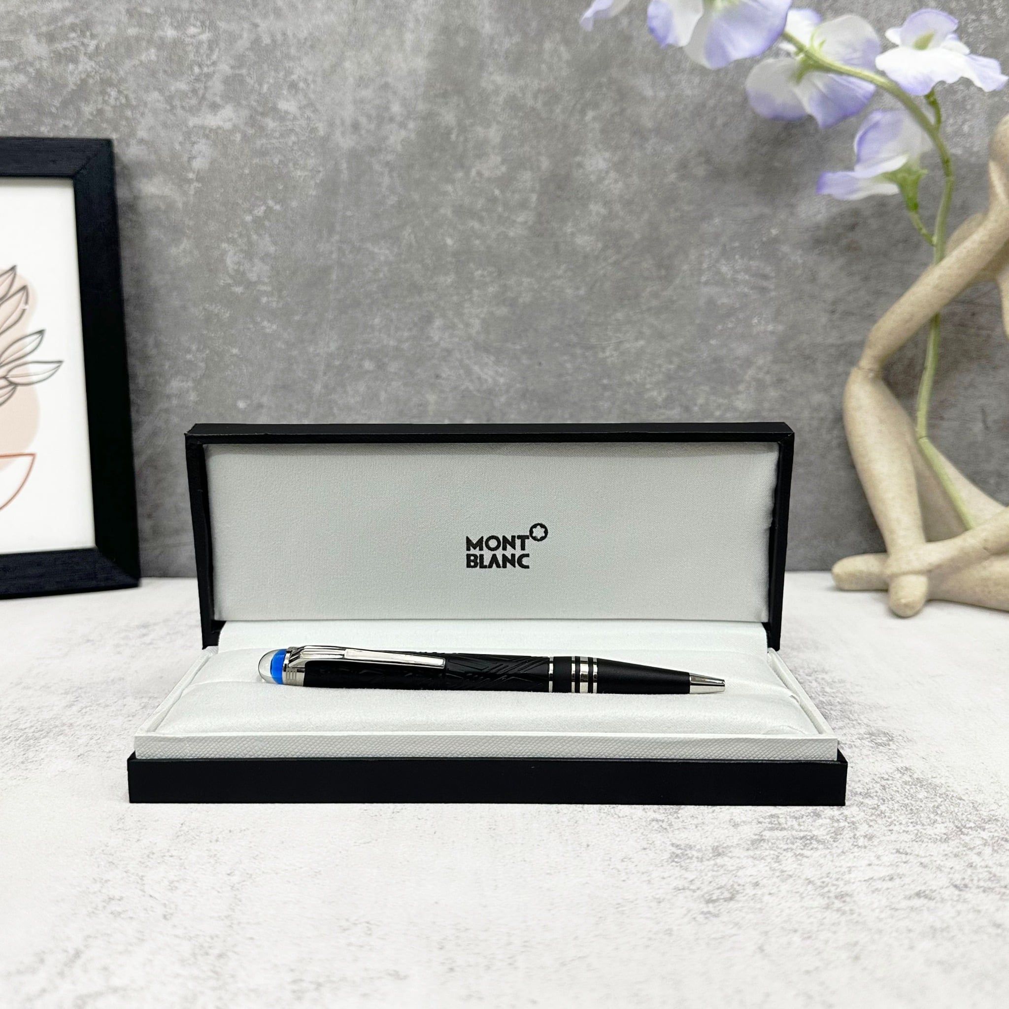 Với thân bút được làm từ nhựa Resin quý, thiết kế điểm nhấn bằng họa tiết Widmanstätten Pattern. Biểu tượng MontBlanc nổi trên nền xanh ở phần mũi trong suốt.