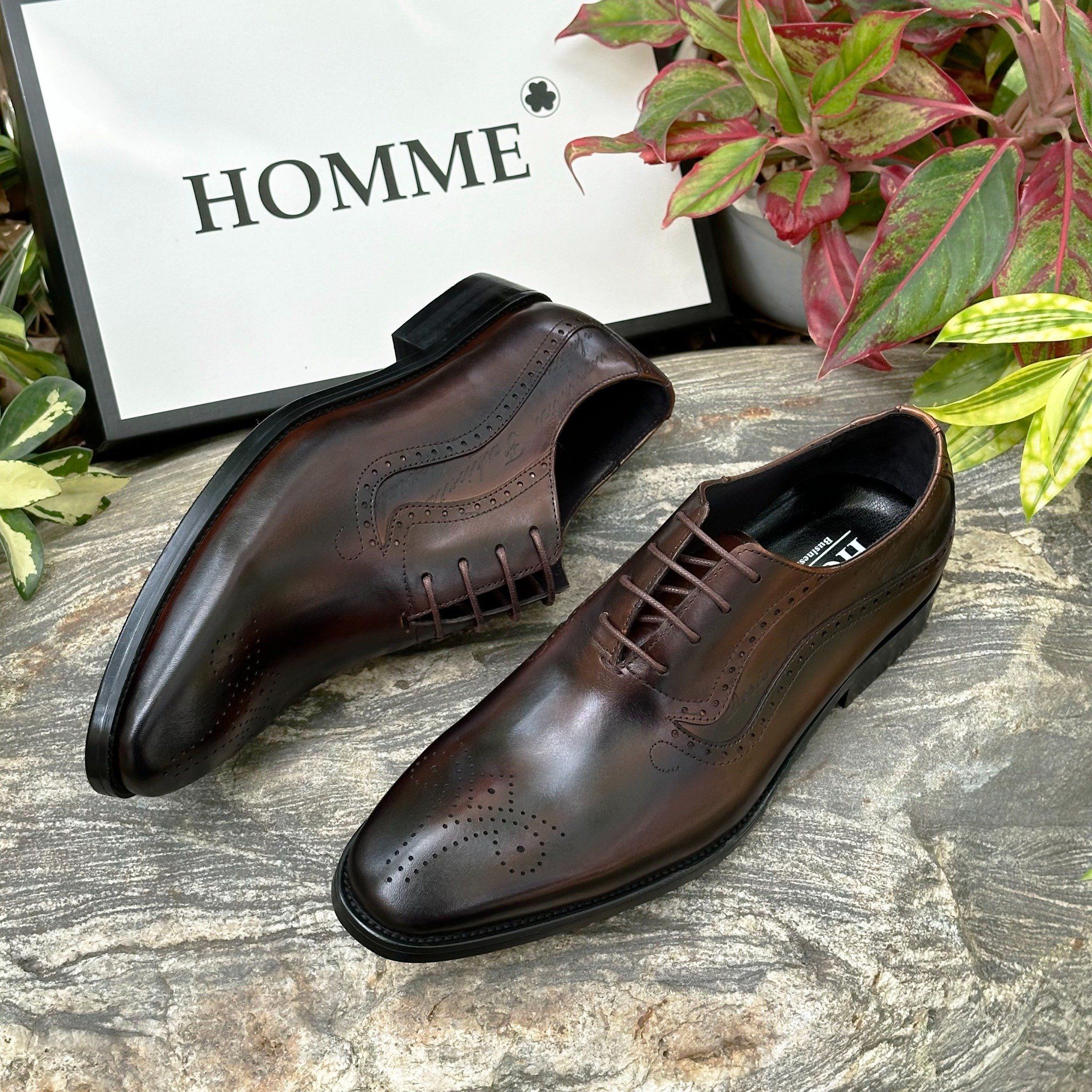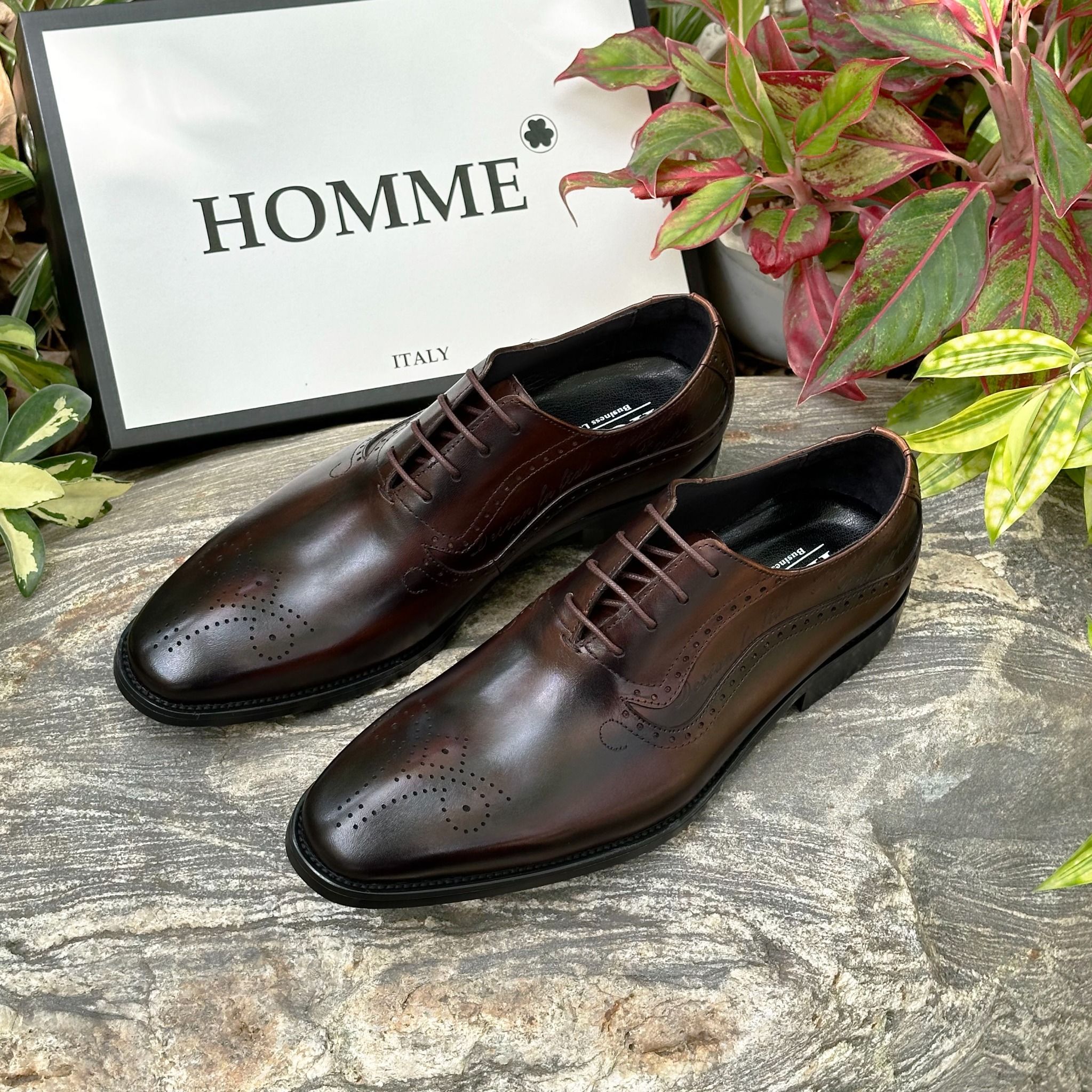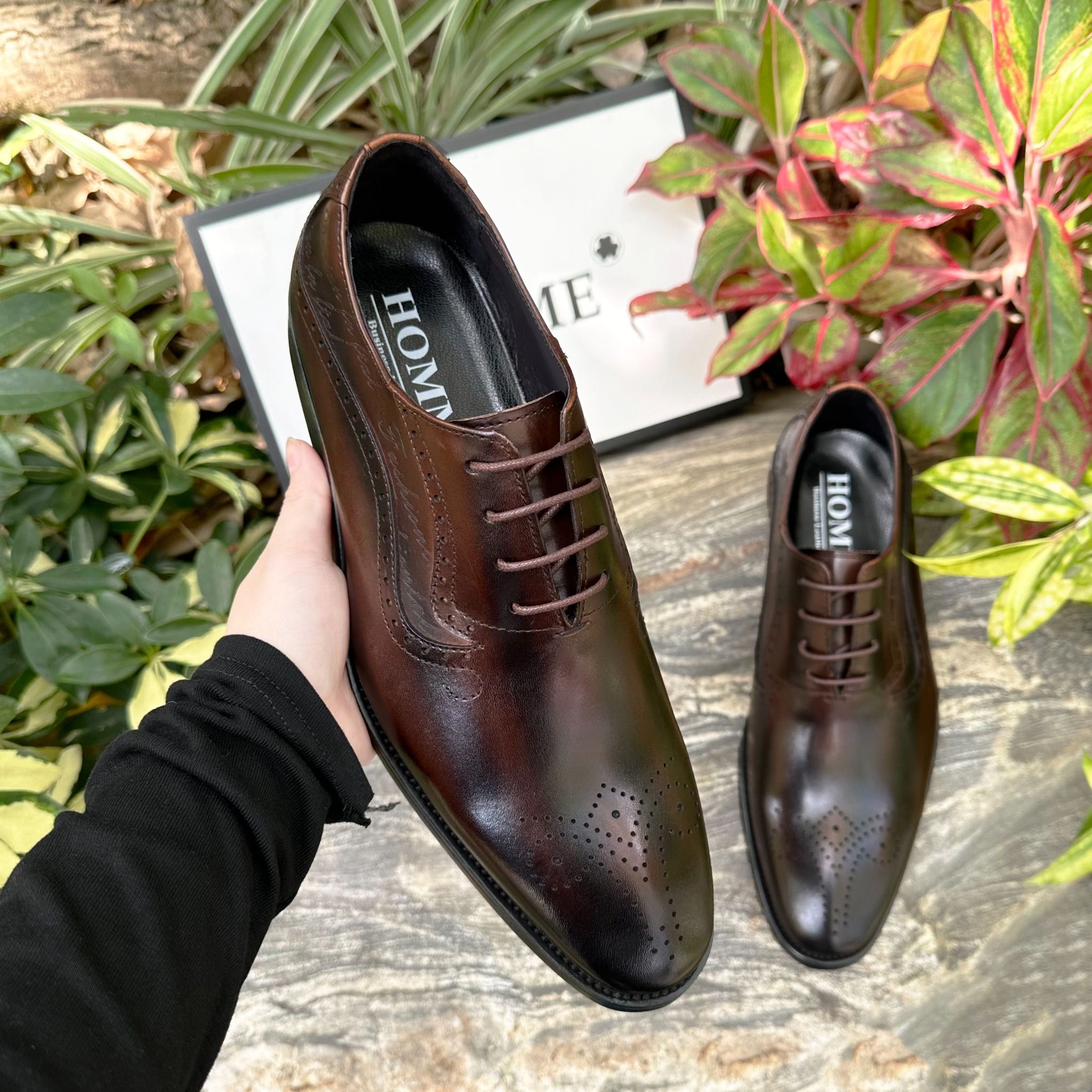 - Kiểu dáng Oxford cổ điển với chi tiết brogue tinh tế trên mũi giày là sự lựa chọn hoàn hảo cho những quý ông yêu thích vẻ đẹp lịch lãm và sang trọng.