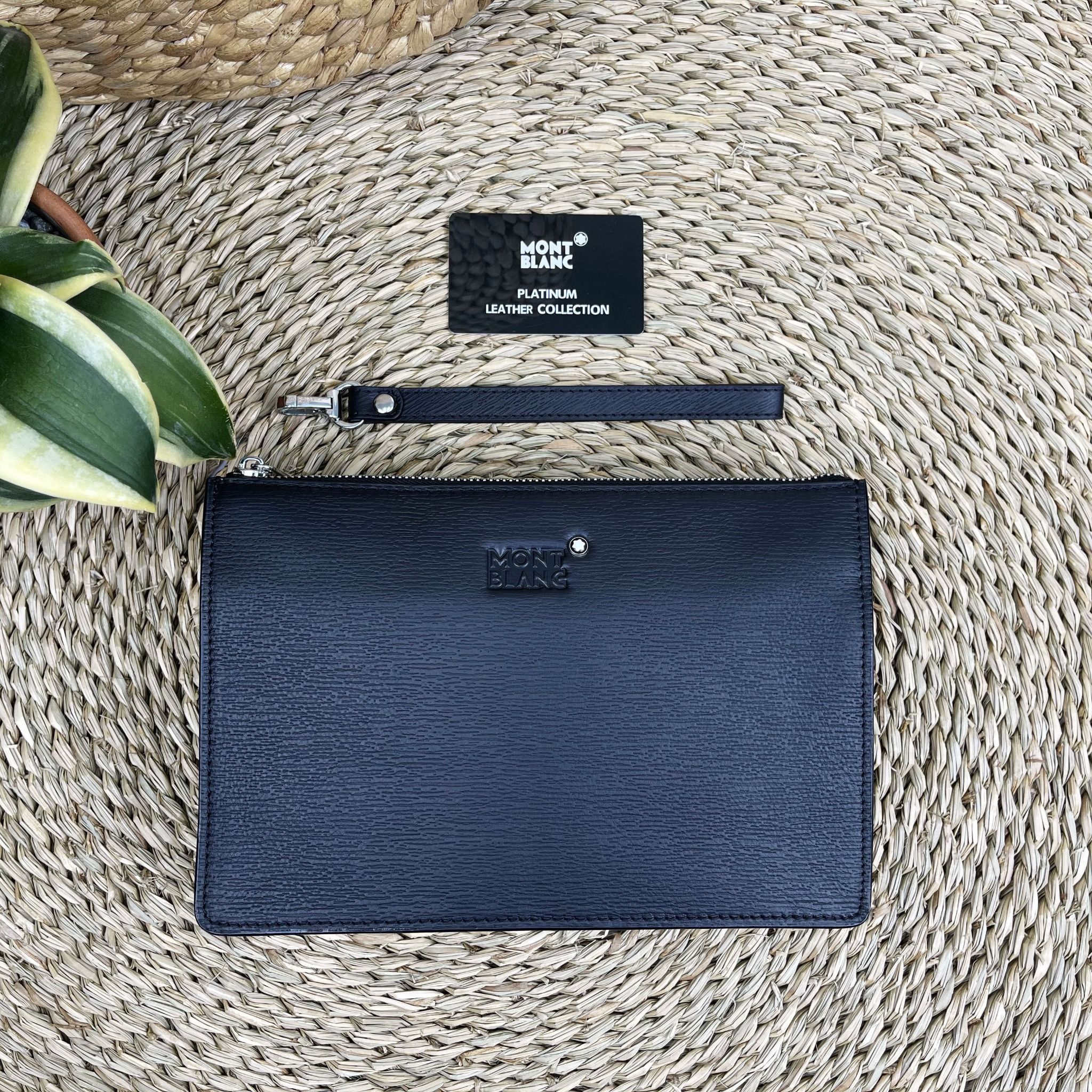 Thiết kế bên trong rộng rãi, lót da có dập logo MonBlanc, có ngăn để card riêng, logo và tên hãng được in ở mặt trước sang trọng, có quai rời tiện lợi cho các anh nào không thích cầm tay nha