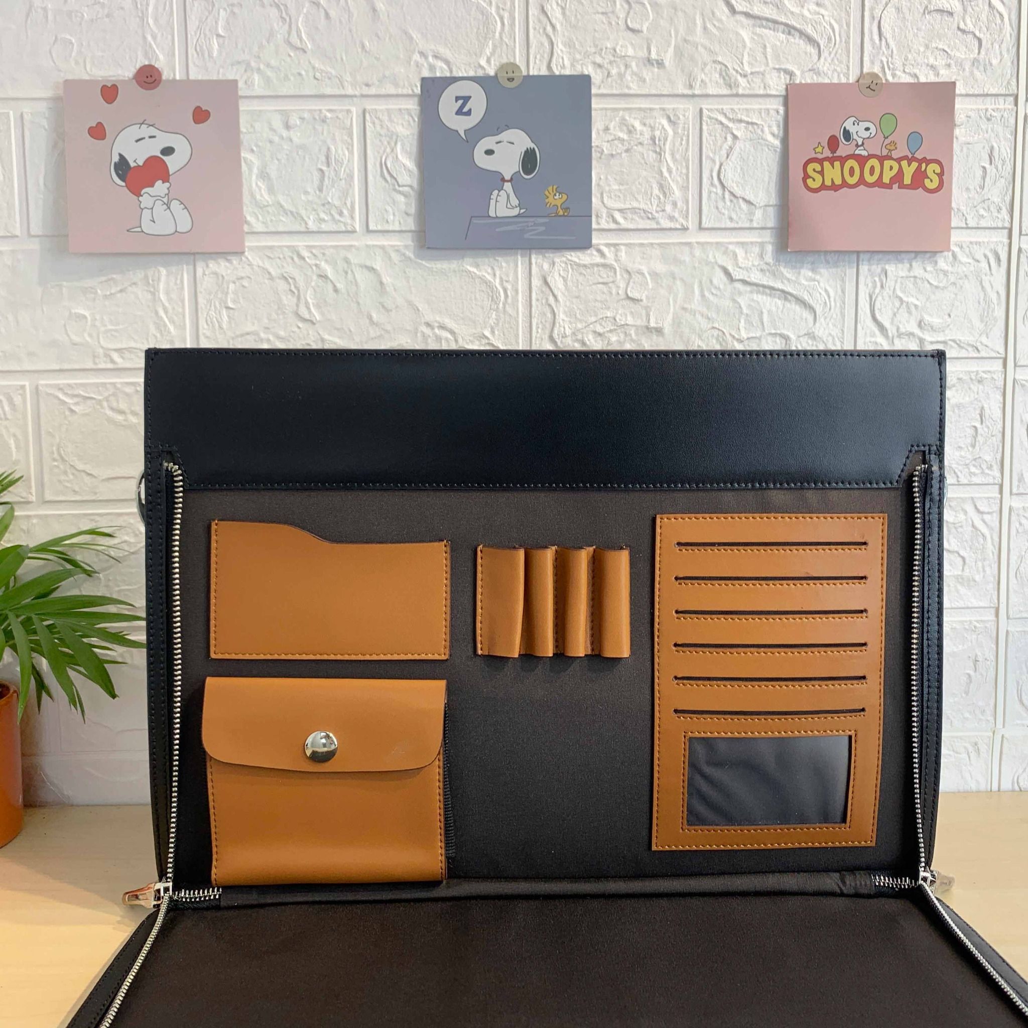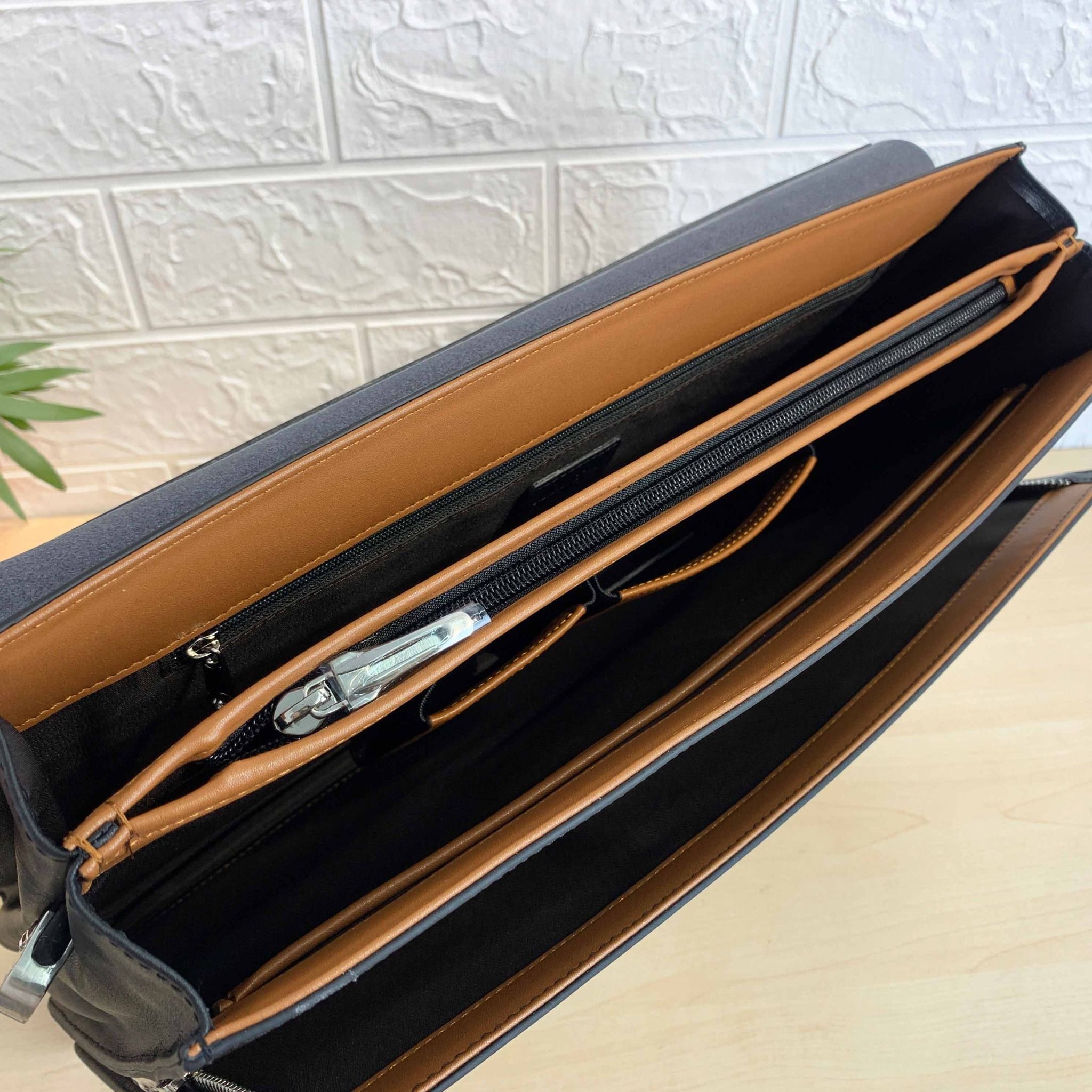 Thiết kế bên trong phân chia nhiều ngăn để sắp xếp tài liệu và vật dụng tiện lợi, không những thế còn có thêm 1 ngăn nhỏ để bút,card,....siêu tiện lợi mà lại không chiếm diện tích làm cặp to hay cồng kềnh đâu ạ