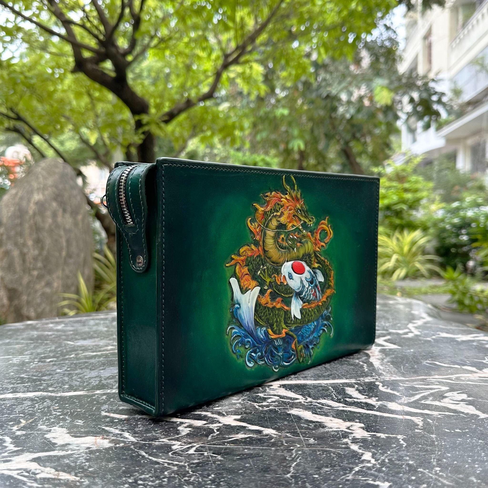 Mỗi chi tiết trên Handbag Homme Pesaro được điêu khắc thủ công bởi những nghệ nhân tài hoa, với hình cá chép và hóa rồng tỉ mỉ, tạo nên một tác phẩm độc đáo và sang trọng. Bên trong chiếc túi này, bạn sẽ tìm thấy các ngăn phụ kéo khóa thông minh và ngăn đựng thẻ, giúp bạn tổ chức và bảo quản đồ dùng cá nhân một cách hiệu quả.